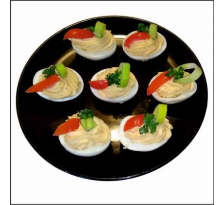 Jednohubka z vejce, vaječné melanže dochucené sardelovou pastou, ozdobená zeleninou.